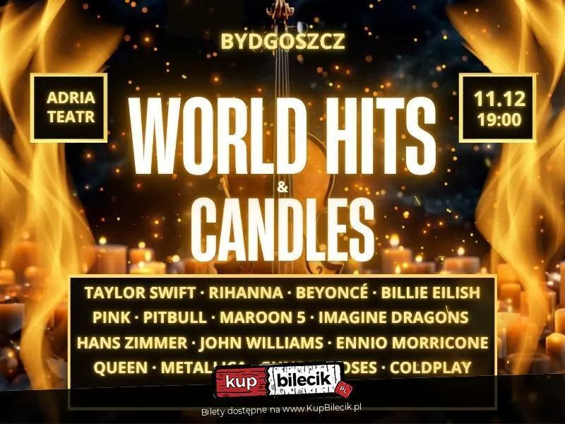 Koncert odbędzie się 11 grudnia o godz.19:00 - Adria Teatr w Bydgoszczy. Koncert trwa 80 minut bez przerwy. Zarezerwuj swój wieczór już dziś i pozwól sobie na chwilę muzycznego uniesienia! Ten koncert to coś więcej niż muzyka - to prawdziwa podróż przez emocje, pasję i piękno. Magiczny klimat tysiąca świec pozwoli Ci oderwać się od codzienności i w pełni zanurzyć w harmonii dźwięków, które pozostają w sercu na długo po ostatnim akordzie. Nie przegap tej wyjątkowej okazji, by doświadczyć czegoś naprawdę niezwykłego. "World Hits & Candles" to koncert, który musisz przeżyć osobiście. Zarezerwuj swój wieczór już dziś i pozwól sobie na chwilę muzycznego uniesienia!