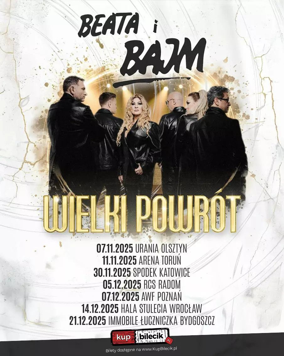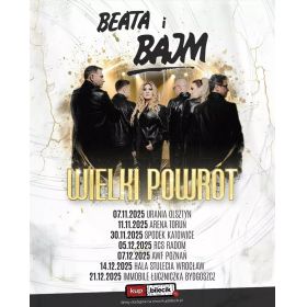 bilety: Wielki Powrót - Beata i BAJM! - Finał trasy Bydgoszcz 21.12.2025 Finał trasy Beaty & BAJM odbędzie się tuż przed Świętami Bożego Narodzenie w Immobile Łuczniczka Bydgoszcz! Spraw sobie oraz swoim bliskim prezent z tej okazji! Jedna z największych ikon polskiej sceny muzycznej - Beata wraz z zespołem BAJM - powraca na wielką trasę koncertową! To wyjątkowa okazja, by usłyszeć na żywo największe hity, które od lat poruszają serca fanów. Energetyczne show, niezapomniane emocje i niepowtarzalny głos Beaty - to gwarancja muzycznego święta. To będzie niezapomniana muzyczna podróż pełna wzruszeń, wspomnień i nowych emocji. Bilety do nabycia na: KupBilecik.plBajm artyści: Beata Kozidrak, Adam Drath, Artur Daniewski, Maria Dobrzańska, Piotr Bielecki, Krzysztof NieściorBajm to polski zespół poprockowy, powstały w 1978 w Lublinie. Jego skład kilkukrotnie się zmieniał, jedyną osobą będącą w zespole od jego początków jest wokalistka oraz współzałożycielka grupy, Beata Kozidrak. Zespół stał się sławny po występie na Krajowym Festiwalu Piosenki Polskiej w Opolu w 1978 roku, gdzie dzięki utworowi "Piechotą do lata" zajęli drugie miejsce w koncercie Debiuty. Nazwa pochodzi od pierwszych liter imion jego założycieli: Beaty Kozidrak, Andrzeja Pietrasa, Jarosława Kozidraka i Marka Winiarskiego. Bilety do nabycia na: KupBilecik.pl |