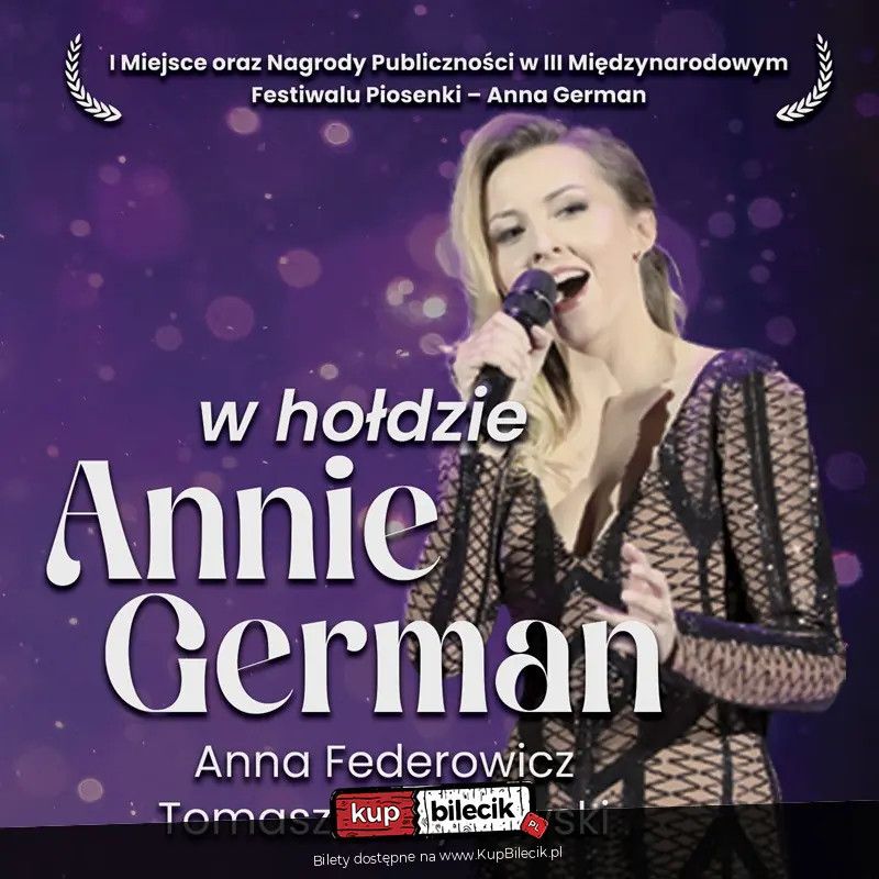 bilety: Zapraszamy na wyjątkowy wieczór - DZIEŃ KOBIET, z piosenkami jednej z najwybitniejszych artystek polskiej piosenki - Anny German. W koncercie wystąpią Anna Federowicz i Tomasz Stroynowski - laureaci pierwszego miejsca oraz nagrody publiczności w III Międzynarodowym Festiwalu Piosenki - Anna German. Gwarantujemy, że wspomnienie wielkich emocji, przepięknej muzyki i mądrych tekstów pozostaną z Państwem na długo. W hołdzie Annie German artyści: Różni wykonawcyZapraszamy na wyjątkowy wieczór - DZIEŃ BABCI, z piosenkami jednej z najwybitniejszych artystek polskiej piosenki - Anny German. W koncercie wystąpią Anna Federowicz i Tomasz Stroynowski - laureaci pierwszego miejsca oraz nagrody publiczności w III Międzynarodowym Festiwalu Piosenki - Anna German. Gwarantujemy, że wspomnienie wielkich emocji, przepięknej muzyki i mądrych tekstów pozostaną z Państwem na długo. Bilety do nabycia na: KupBilecik.pl |