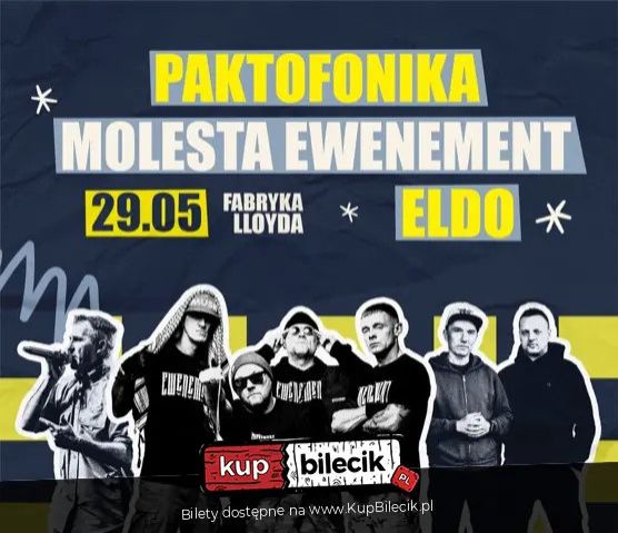 | PAKTOFONIKA ORKIESTRA & MOLESTA EWENEMENT & ELDO | 29.05.2026 | BYDGOSZCZdodano 2026-01-27 19:14:55 Pierwszy taki projekt na plenerowej scenie Lloyda! Już 29 maja pierwszy raz podczas jednego wieczoru na naszej scenie wystąpią: PAKTOFONIKA ORKIESTRA, MOLESTA EWENEMENT ORAZ ELDO! Podczas koncertu usłyszymy największe utwory Artystów, klasyki polskiego Hip-hopu. To będzie prawdziwy powrót do przeszłości i wieczór pełen dobrej muzyki. Paktofonika artyści: Fokus, RahimFokus / Rahim to raperzy doskonale znani polskiej publiczności oraz scenie hip-hopowej. Do 2003 roku współtworzyli legendarny skład Paktofonika, który po śmierci Magika zakończył swoją działalność. Wspólnie podjęli decyzję o kontynuacji swojej przygody z rapem i w 2003 roku stworzyli Pokahontaz. Obu raperów cechuje dość ciekawe postrzeganie świata, które od zawsze przenoszą na kartki papieru, a następnie do studia dając swoim fanom nietuzinkowe albumy. Koncerty Paktofoniki, podczas których usłyszymy największe utwory artystów, mają za zadanie przenieść wszystkich fanów w sentymentalną podróż do przeszłości. Bilety do nabycia na: KupBilecik.pl |