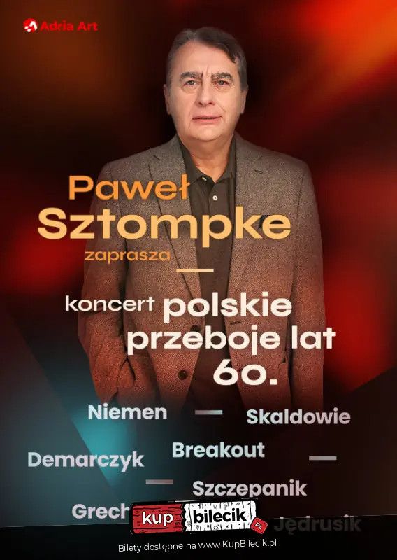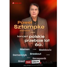 bilety: Koncert z piosenkami z kultowych polskich seriali, które budzą sentyment i przywołują najpiękniejsze wspomnienia - teraz na żywo! "Paweł Sztompke Zaprasza - piosenki z polskich seriali" to wyjątkowe spotkanie z muzyką doskonale znaną z telewizyjnych hitów sprzed lat i współczesnych produkcji. To podróż przez historie i emocje zapisane w utworach, które od dekad towarzyszą widzom przed ekranami. Paweł Sztompke zaprasza artyści: Paweł Sztompke, Bartek Wanecki, Emilia Hamerlik, Mateusz Wiśniewski, Kacper Kasprzak i inniZapraszamy na niezapomniany koncert, który przeniesie Cię w magiczny czas największych hitów lat 60.! "Muzyczne podróże - polskie przeboje lat 60." to wyjątkowe wydarzenie, które poprowadzi Paweł Sztompke, legendarny głos polskiego radia. W programie koncertu usłyszysz największe hity artystów, którzy kształtowali polską muzykę w tamtych czasach. Zabrzmią niezapomniane utwory Czesława Niemena, Marka Grechuty, Kaliny Jędrusik, Piotra Szczepanika oraz takich zespołów jak Skaldowie czy Breakout. Bilety do nabycia na: KupBilecik.pl |